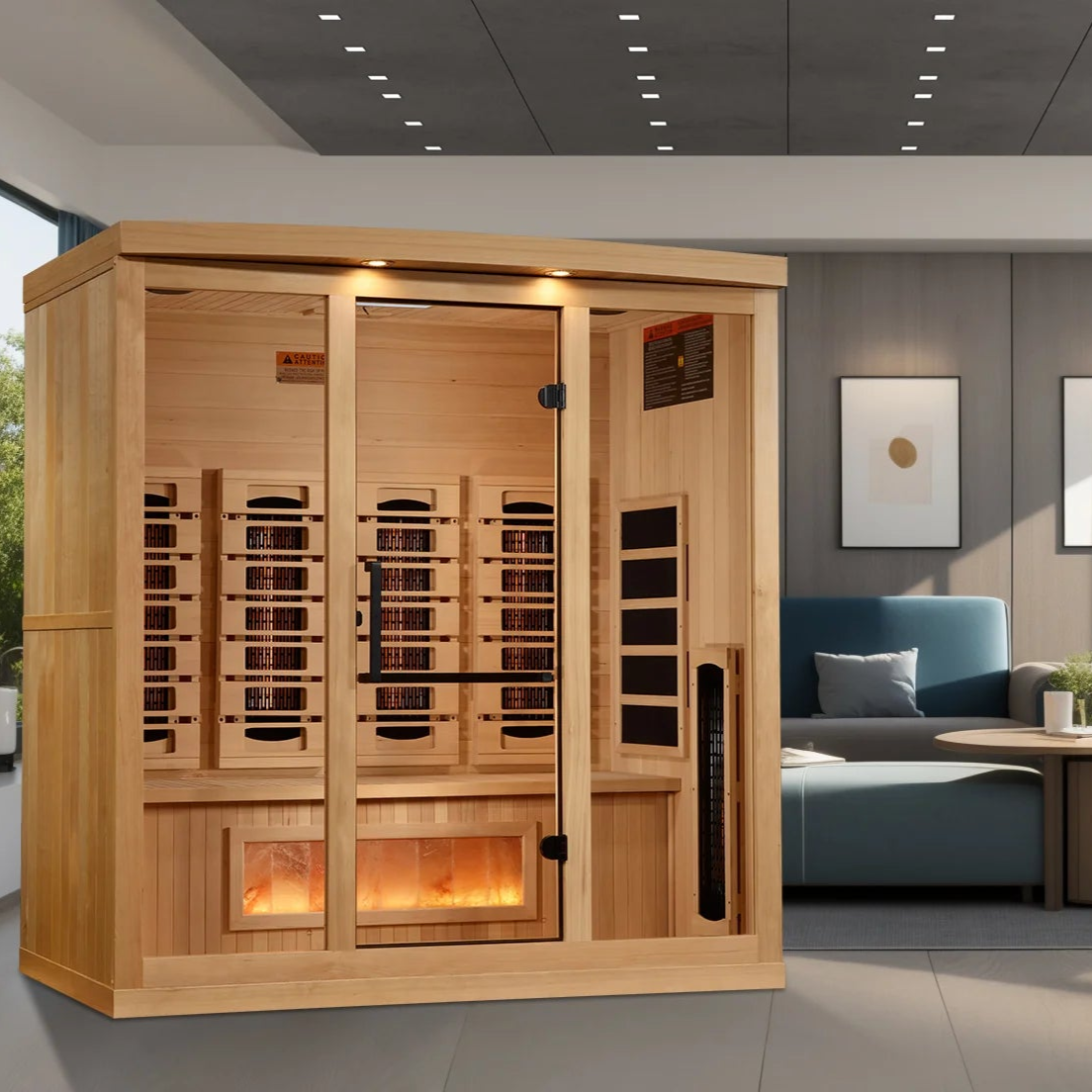 Golden Designs “2025” Full Spectrum 8000 Reserve Series with Himalayan Salt is constructed of 100% Canadian Hemlock Fir and easily assembled by two adults. Heating panels feature PureTech™ Heating Technology that uses NEAR, MID and FAR wavelengths to deliver full spectrum heat while maintaining a near zero EMF standard.