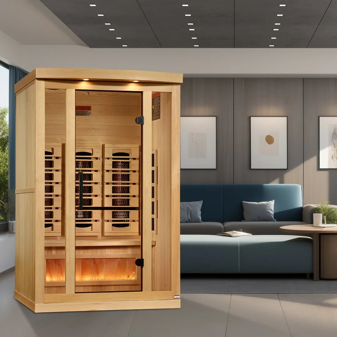 Golden Designs “2025” Full Spectrum 8000 Reserve Series with Himalayan Salt is constructed of 100% Canadian Hemlock Fir and easily assembled by two adults. Heating panels feature PureTech™ Heating Technology that uses NEAR, MID and FAR wavelengths to deliver full spectrum heat while maintaining a near zero EMF standard.