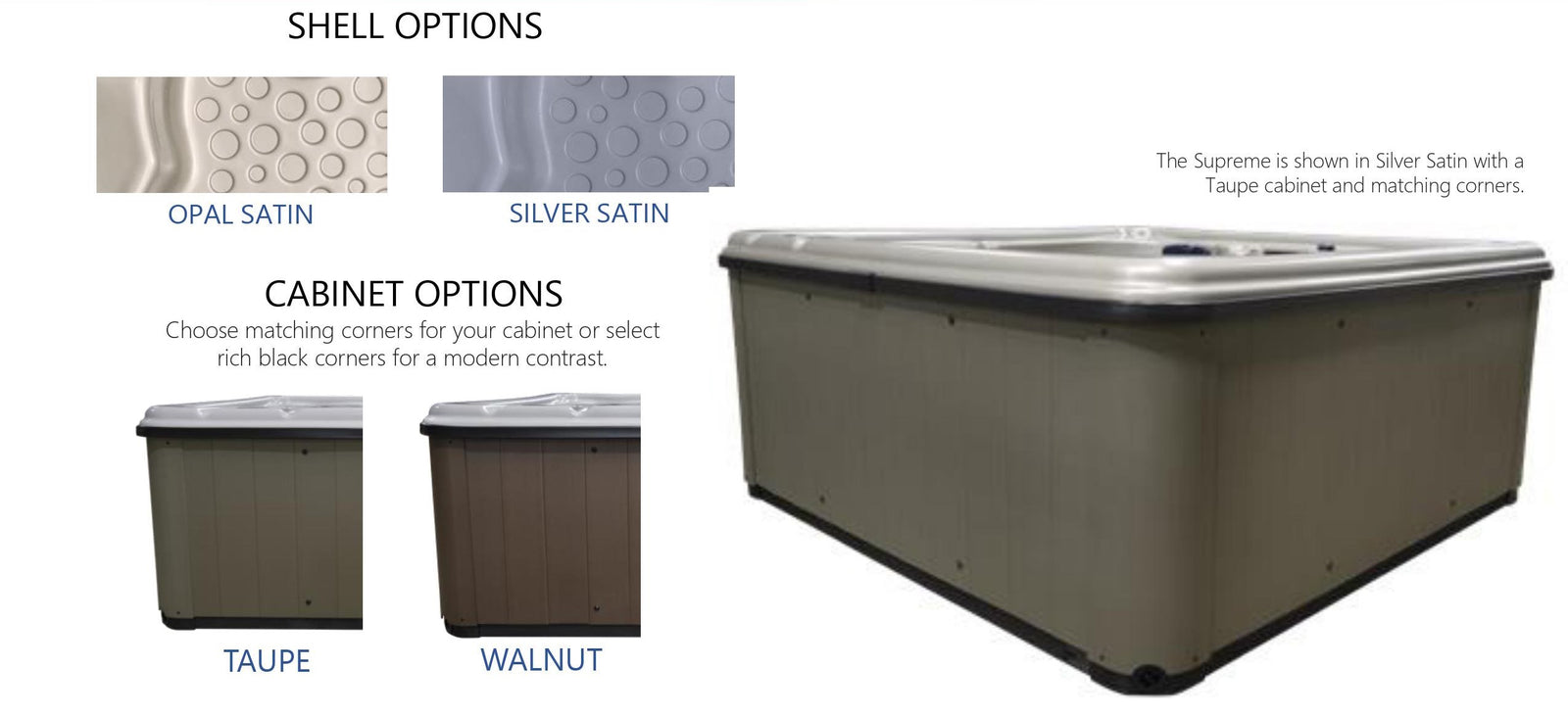 The Supreme collection of hot tubs delivers a variety of seats and jet configuration to fit your needs. LED lighting and a soothing waterfall set the mood for relaxing alone or with friends and family.